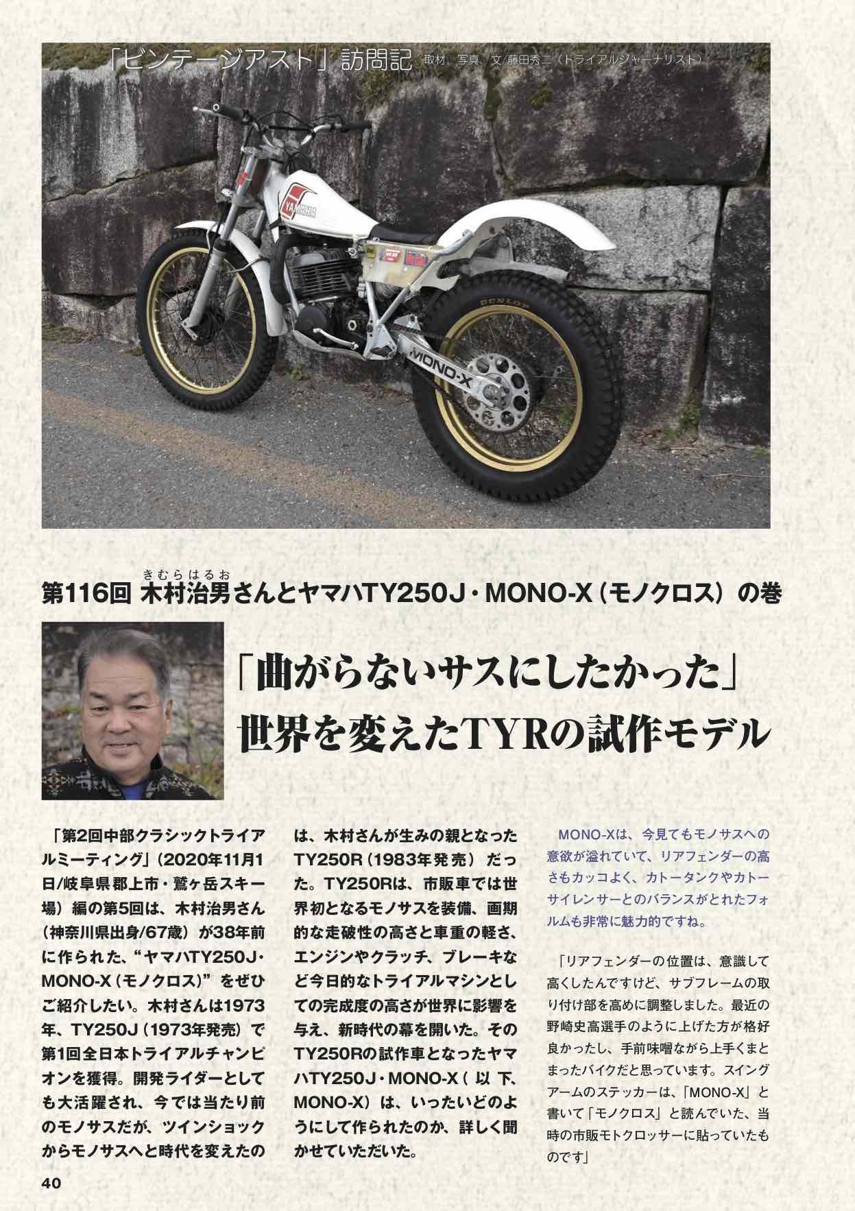 ビンテージアストはヤマハトライアルの生みの親、木村治男さんとTY250J・MONO-X(モノクロス)。2本サスからモノサスペンションへと世界を変えたマシンのお話など、ストレートオンならではの内容もバッチリです。