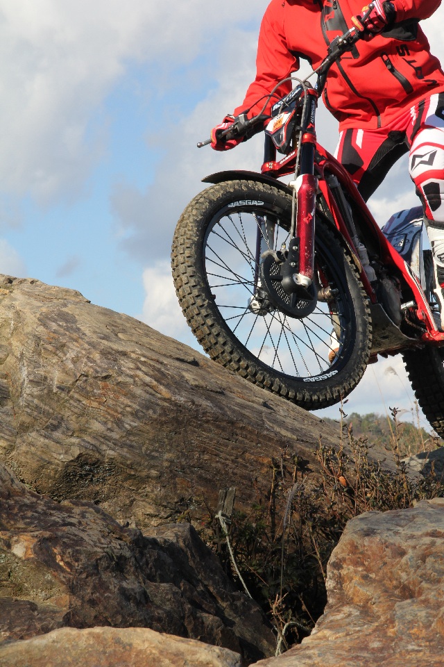 本体素材には、従来補強剤として使われるカーボンに代わり、スタッドレスタイヤにも使われる「シリカ」を配合。タイヤのゴム自体のグリップ力を上げてあります。「シリカ」はスタッドレスタイヤに使われている素材で、特に気温が低い時でもタイヤの柔らかさを保持します。と言うことは、全日本トライアルの寒い時期の開幕戦真壁や最終戦のSUGOでも安心して同じ性能を発揮するということです。