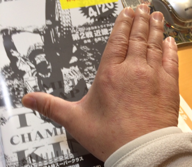 肘部管症候群、経過。最終(?)報告 P 2015年4月1日 , by straighton-DM K 発行人のつぶやき 本日朝一で、術後一ヶ月診断。手術は3月3日でした。 とりあえず、スポーツも日常生活も通常復帰OKです。 指のしびれは相変わらず。これは数ヶ月かけて解消する見込み。 筋力低下は…。 現状、まだ神経が復活していないので、低下し続けています。 最も元気だった頃の右手握力→65kgくらい、手術直前→45kgくらい。今日現在39kg。 今日から筋力向上に努めます。しかし、復調するのは月単位、年単位ということで、気長にやりますよ。 おしまい。 今年の3月13日の手。 本日4月1日の手。げっそり痩せています(右手だけは) 手術の跡はこうなっています。