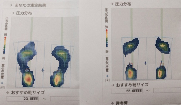 足型測定 P 2015年6月27日 , by straighton-DM K 発行人のつぶやき ストレートオン7月号も無事全入稿が済み、今日はちょっと一息。 足型測定してきました。 画像左側がワタクシ。23.0EEEで日本人的(わずかに広め)だそうです。 右は小学校6年生の娘。22.0EEEEでかなり幅広。しかも「ハイアーチ」で土踏まずが浮いています。 ワタクシの足の長さは左右で0.1cmの差だそうで。 だからどうだ、と言うことはないですが、日本製の靴が合いそうだ、と言うことが判りました。 いまさらですけど。