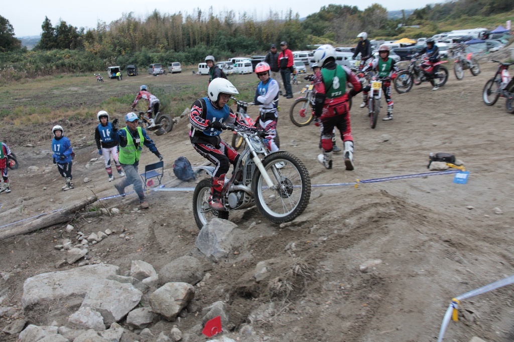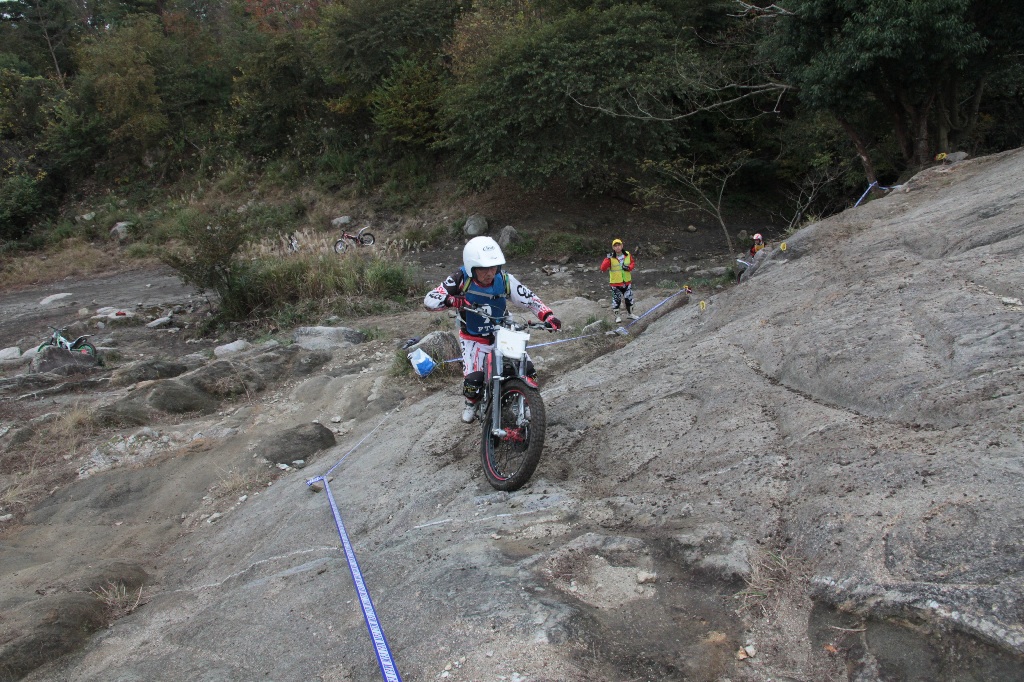 セクションは、いつも通り危険を低く、でもだらだら〜と走ればOKというわけでもなく、クリーンを狙うにはよく走行ラインを見て選んで、それなりに技も問われます。そういう主旨なので、捻りが効いたところがいくつかあります。直線的にバババーン!と走りたい人には少々フラストレーションがたまるようですが、捻り技を効かせてクリアする醍醐味がありますし、足を着く場所を見極めるのも、また、トライアル経験の積み重ねになります。