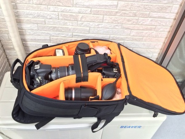 新しいのは、リュックサックタイプで、ボディ2機と交換レンズやストロボなど必要機材を入れても少し余裕がある大きさです。前面ファスナーがガバッと開いて全ての機材が並んでいるのも使いやすそうです。さらに、その気になればノートパソコンまで入るという。
