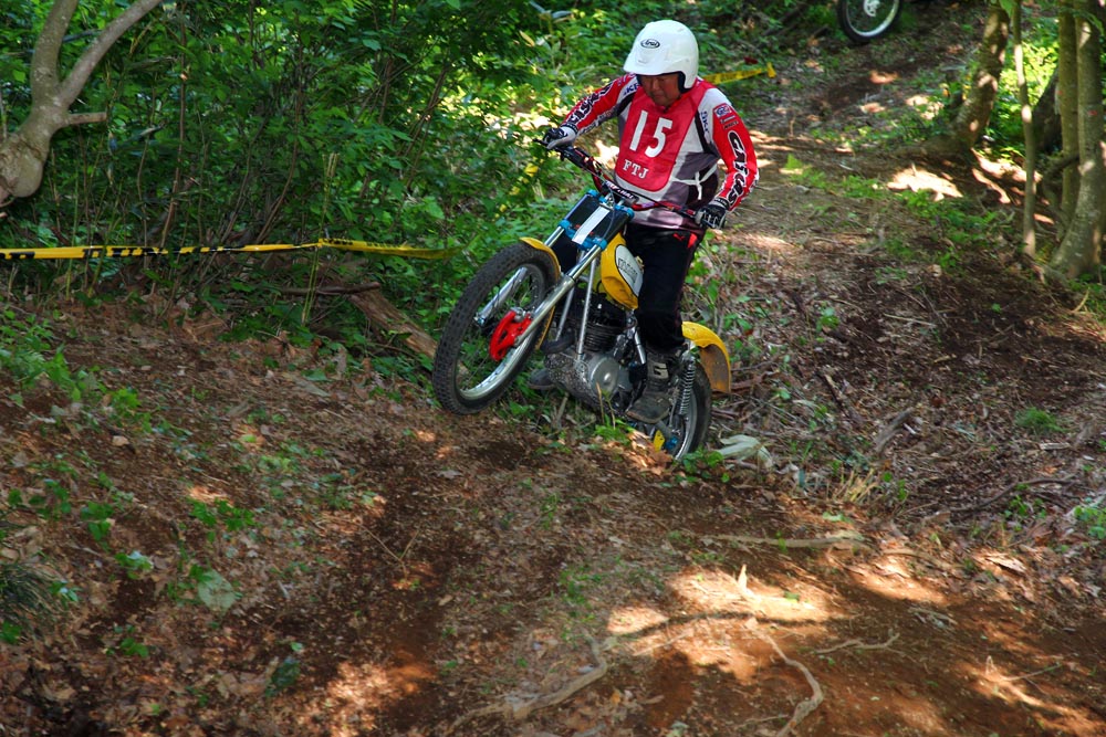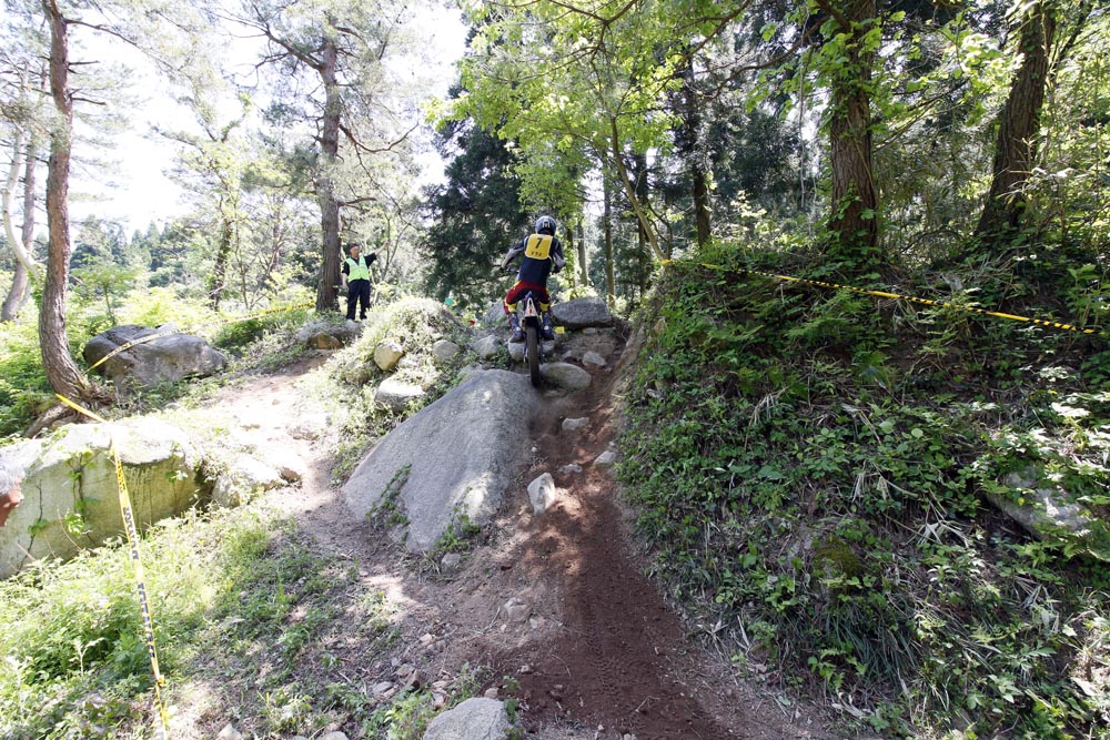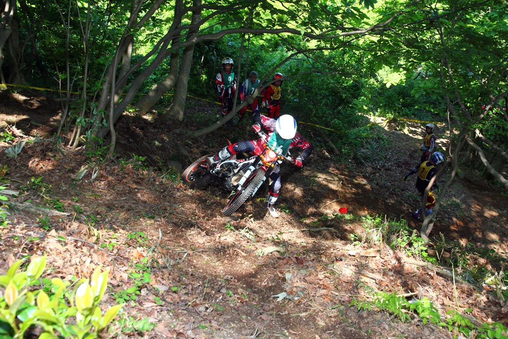 この会場、セクションとなる地形は山の斜面と丸石が続く沢が主です。斜面では基本的なターン技術と登りのスロットル&クラッチコントロール、下りのデリケートなブレーキ操作が問われます。いかんせん、普段は走り込まれていない場所なので、路面がふかふかだったり落ち葉にタイヤを取られたりするので「基本操作の正確さ」が問われました。