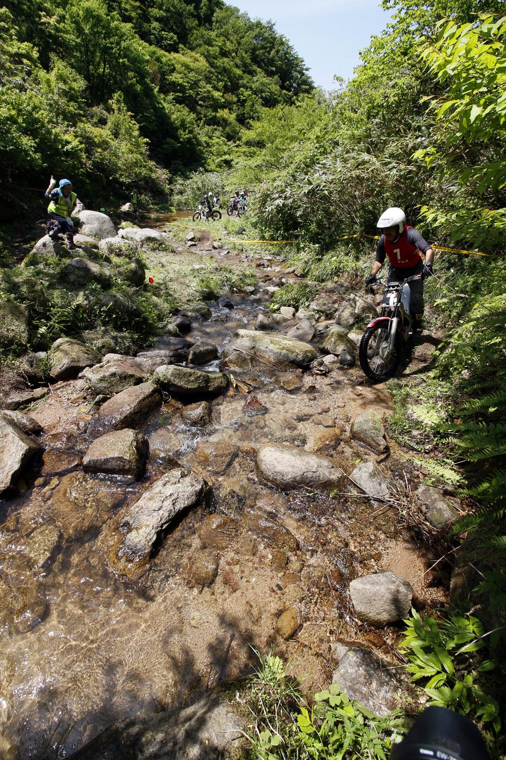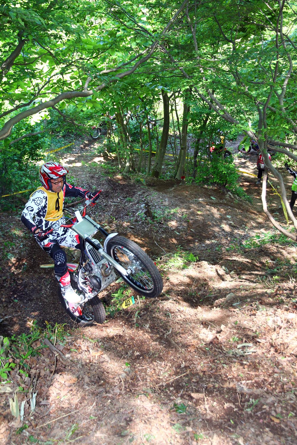 滑る沢でも、適切な速度とスロットルコントロール、ライディングポジションや肘、膝の使い方で減点数に差がつきます。そう、怖いくらいの高低差はなくてビギナーでも充分チャレンジ出来るのですが、トライアルライディングの習熟度で差が付くという、まさにマスターズトライアル向きの地形です。