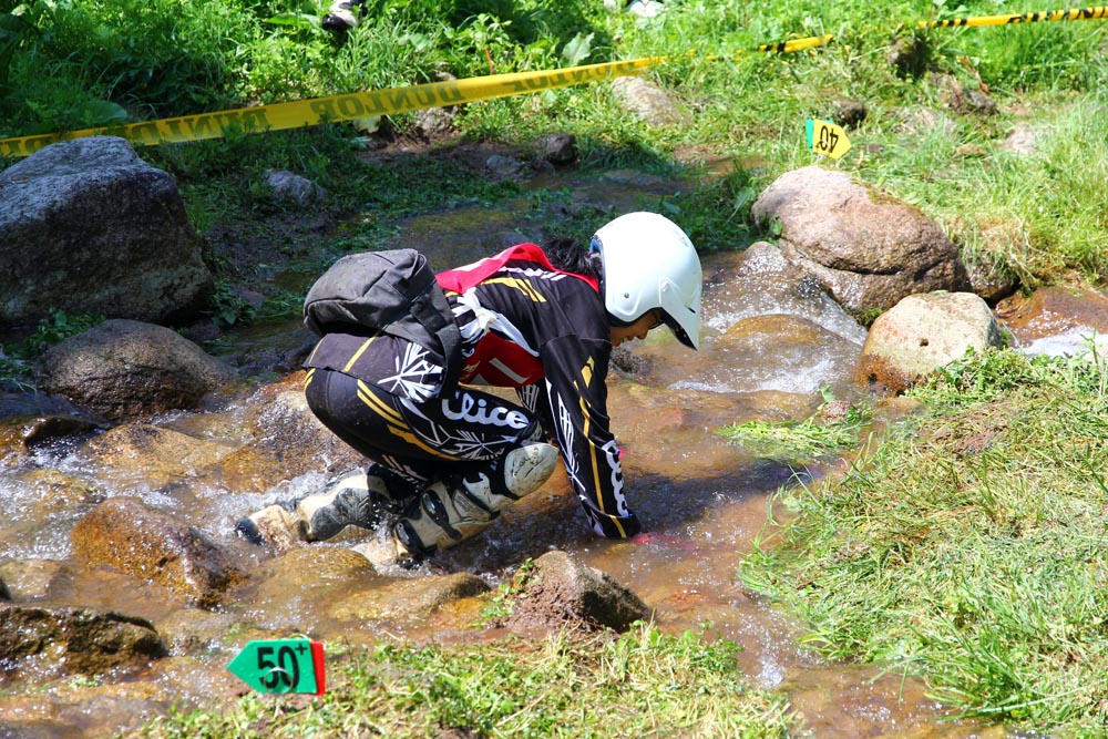 沢セクションは…。高低差はないのですが、沢の丸石がなかなかツルツルしてくれていて、下見で足を滑らせるんです。中には水浴びをした選手もいましたよ!大会取材中の人も、人知れず足を滑らせてコロンと…。しかも複数回(^_^;)