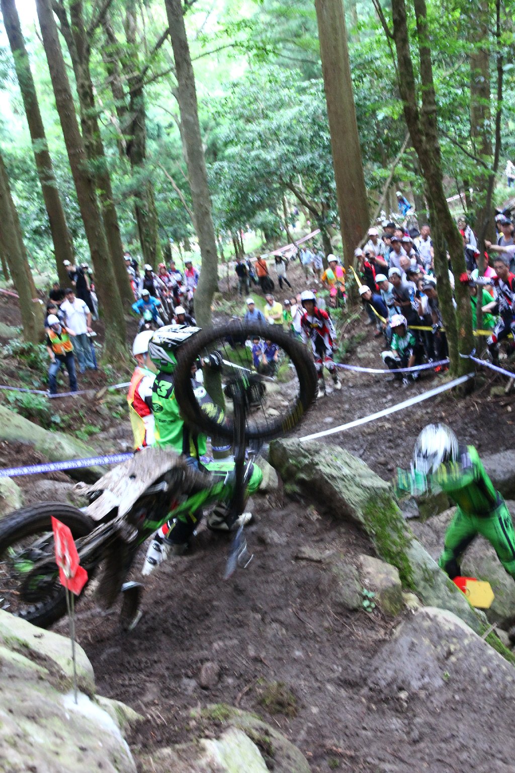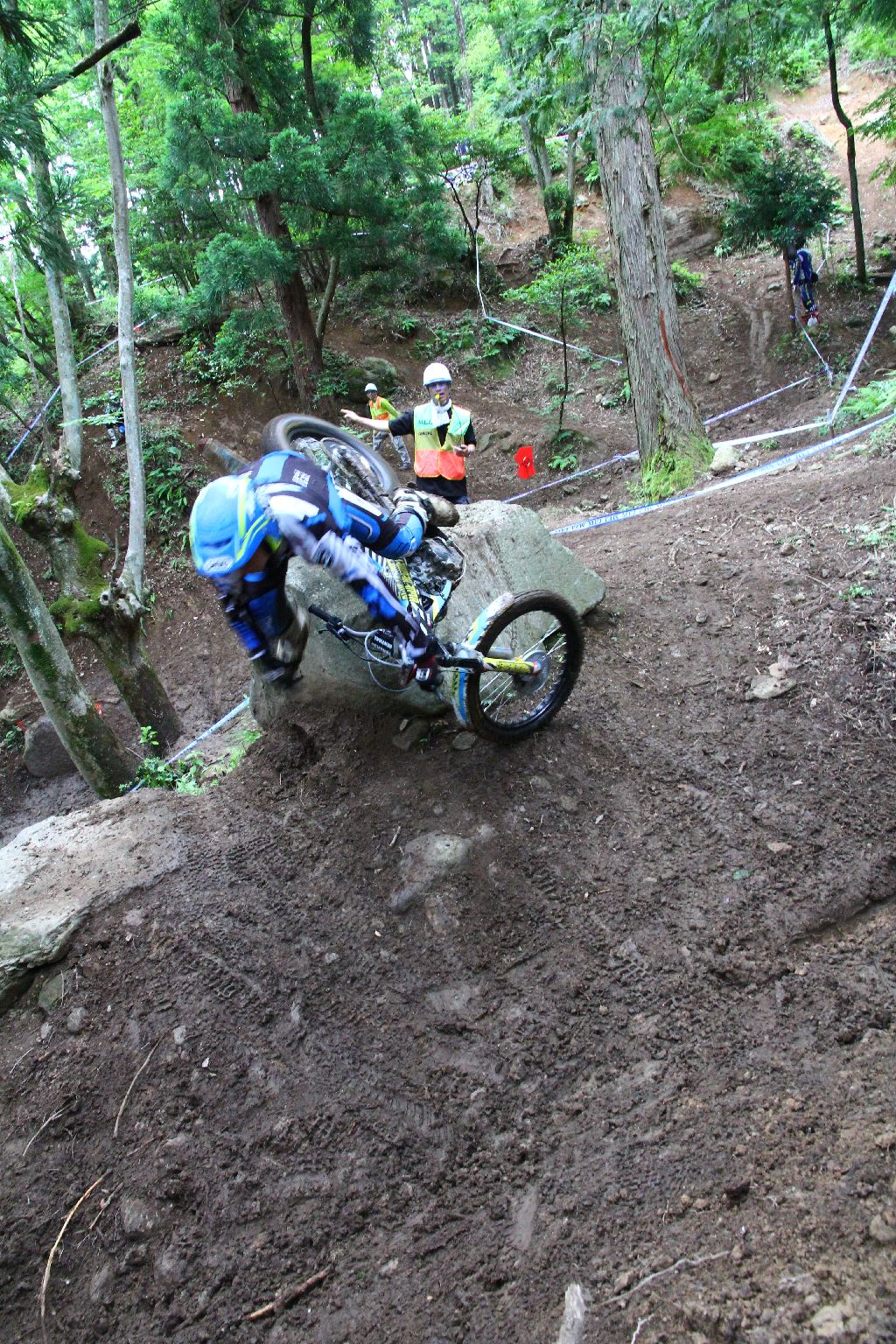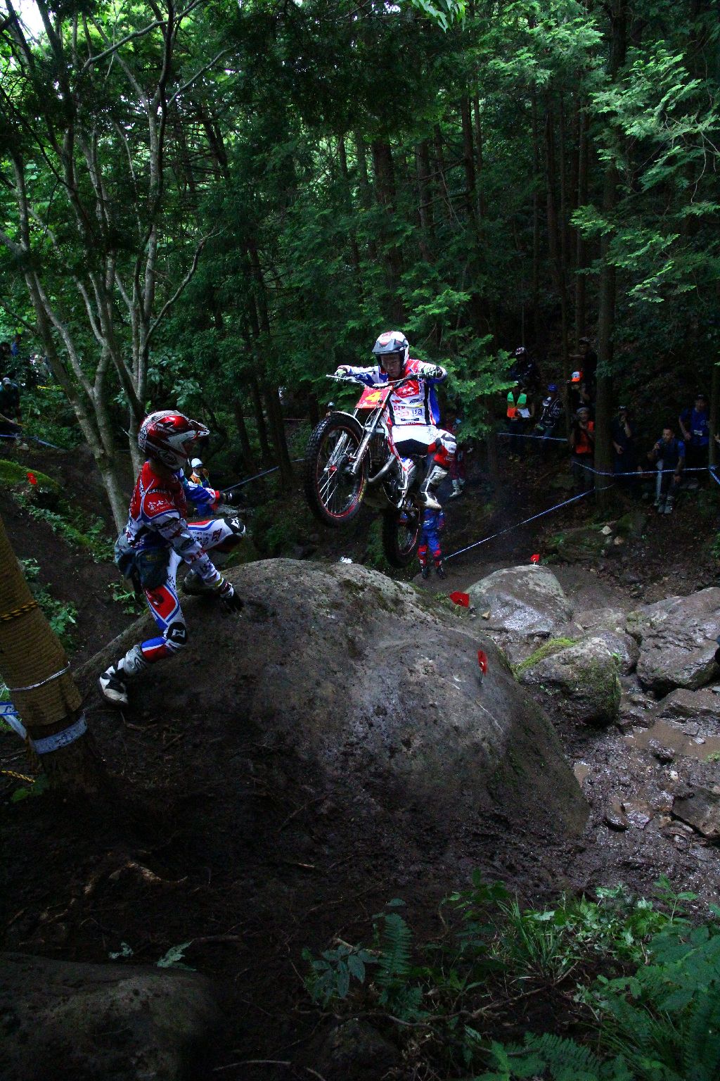 実際、歩いて見て回ると判りますが、丸石もツルツル、土もツルツル、こんな路面でなんで2メートル近い大岩に駆け上がれるのか不思議です。トライアルライダーってどれだけ凄いか!がよく判ります。さらに、ひとセクションは1分以内で走りきらなければ減点5となります。飛んでもないスピードの中でタイミングを取って障害物を越えたり前輪や後輪を飛ばして方向転回したりと、ダイナミックなライディングは、まさにアンビリーバブルでした。
