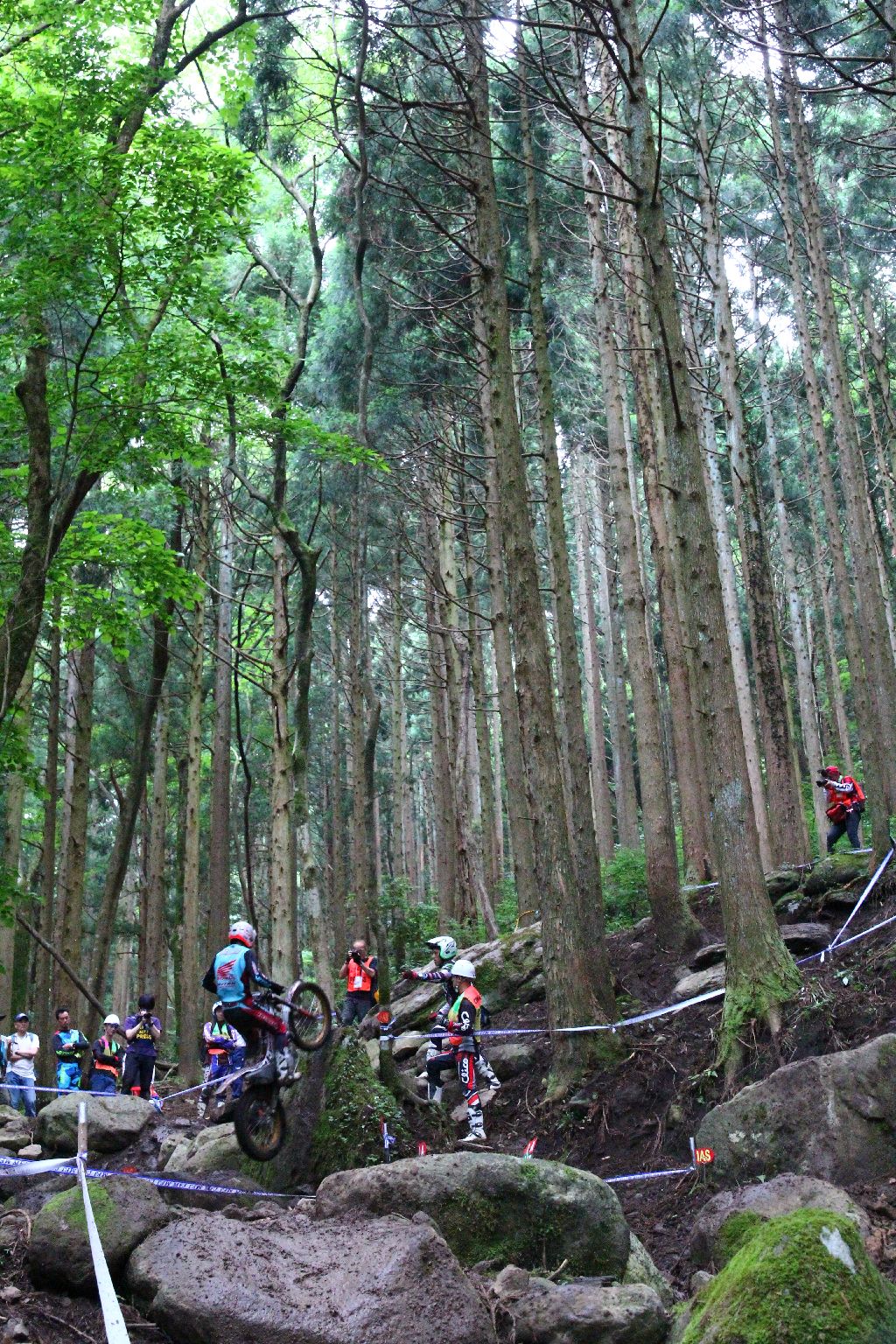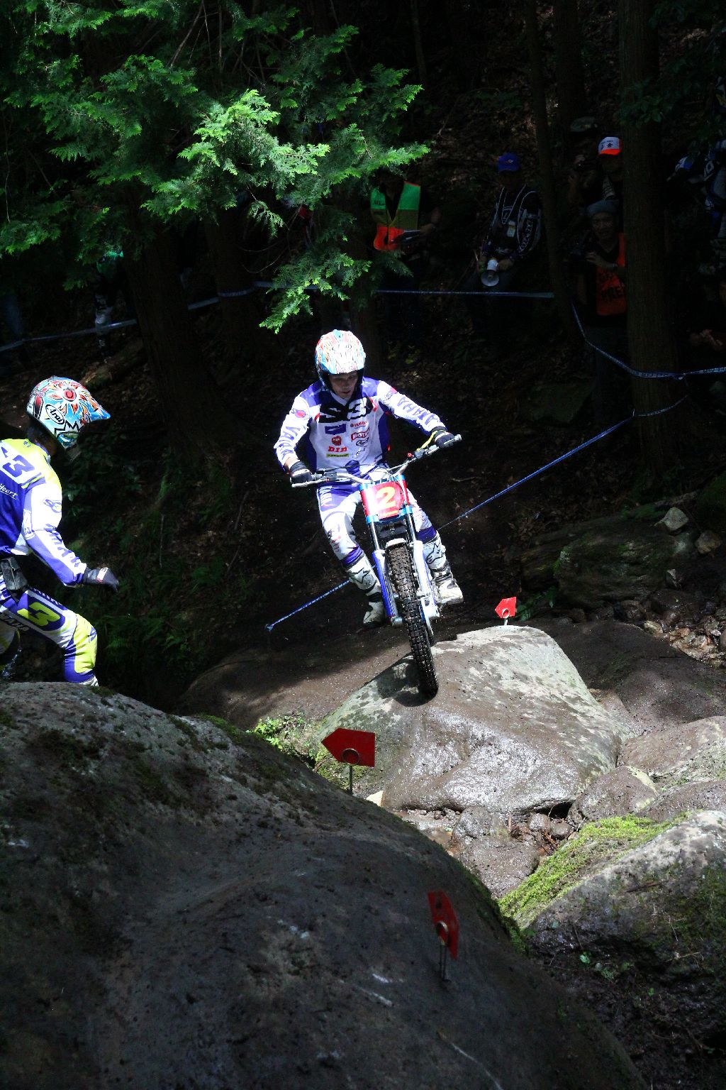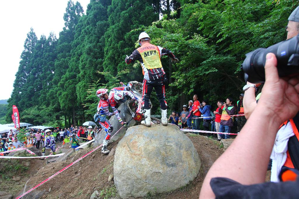 実際、歩いて見て回ると判りますが、丸石もツルツル、土もツルツル、こんな路面でなんで2メートル近い大岩に駆け上がれるのか不思議です。トライアルライダーってどれだけ凄いか!がよく判ります。さらに、ひとセクションは1分以内で走りきらなければ減点5となります。飛んでもないスピードの中でタイミングを取って障害物を越えたり前輪や後輪を飛ばして方向転回したりと、ダイナミックなライディングは、まさにアンビリーバブルでした。