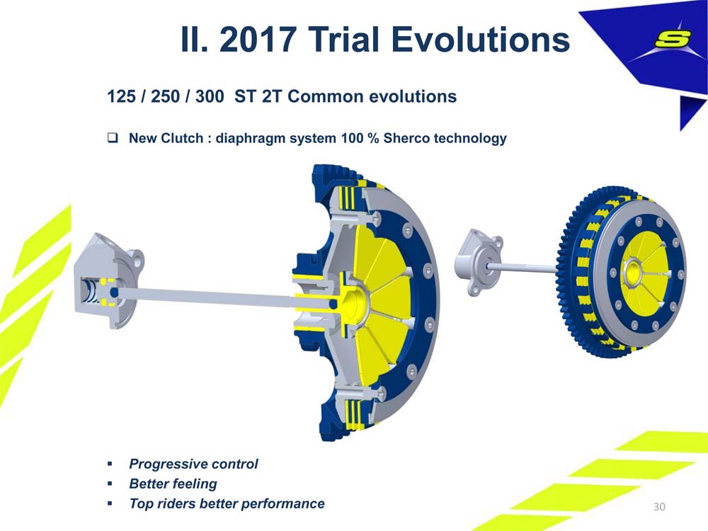 シェルコの次モデルはダイヤフラム式クラッチ!? P 2016年7月14日 , by straighton-DM K ニューモデル, 新着情報, 最新トライアル情報 フランスのSHERCO本社からの情報によると、2017年モデルのシェルコSTシリーズの大きな変更は、 1.デュアルイグニッションシステム 2.ダイヤフラム式クラッチシステム だという。 デュアルイグニッションシステムは、エンジンの低回転時に、クランク1回転で2度スパークさせることでエンジン回転の安定化を狙うもの。TRSとGASGASでも採用されている。 ダイヤフラム式クラッチシステムは、シェルコオリジナルということで、TRSやGASGASと、どう違うのか?興味津々だ。
