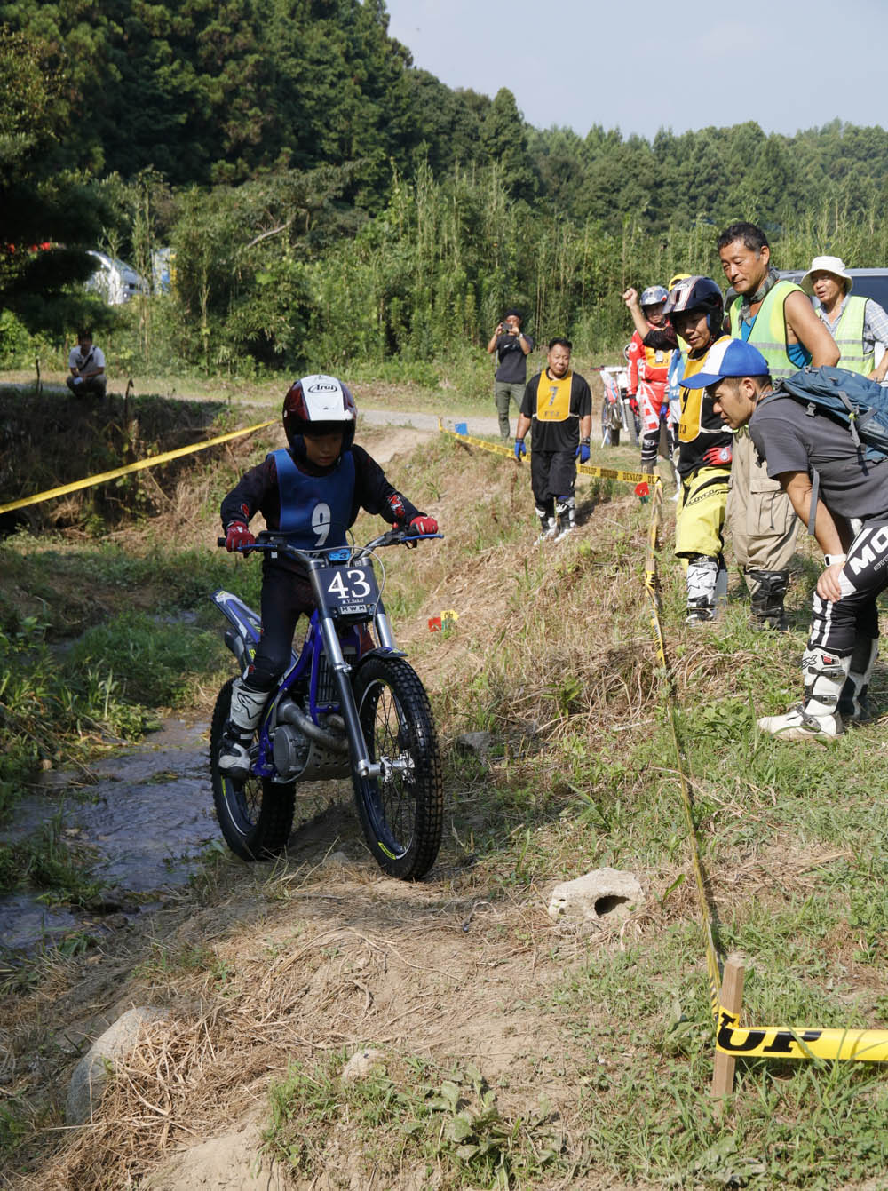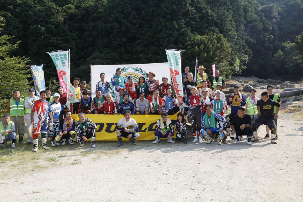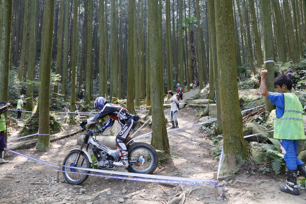 スタッフは、地元の寅吉一家の皆さんの他、長崎、大分など近隣からも大勢集まって来てくださって、1セクションに3人ずつのオブザーバーが付くという完璧さ。そして、選手達は、1分間隔で特設スタート台からスタート、1セクションから順にトライする形式。オブザーバーの死角のない正確なジャッジと選手の真剣トライで、さながらMFJ全日本トライアル選手権のようです。少し違うのは、真剣トライの末の珍プレーにあちこちで笑い声が起こったり、木陰で座って休憩しつつ、他の選手の走りを眺めたり冷やかしたりと、楽しい雰囲気なのでした。