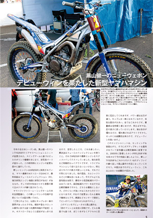 黒山健一選手のFI+後方排気エンジンのニューマシンから四十雀トライアル、マスターズトライアル、ドギー・ランプキンのマン島一周チャレンジなど、知識&情報、お楽しみ読み物満載。さらにテクニックはトニー・ボウの三次元ライディングを目指す入口の技など。お楽しみに。