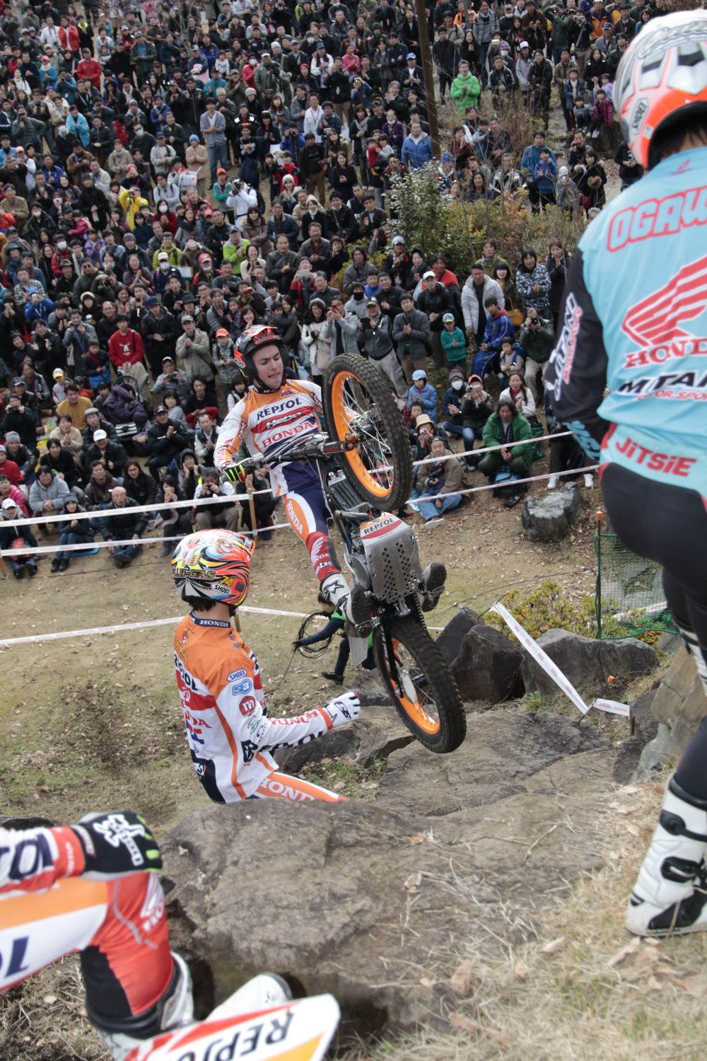 今回のデモは、トニー・ボウ、藤波貴久、ハイメ・ブスト、小川友幸という世界の超一流が、お互いに「イケイケ」で攻めます。もちろん、限界もよく判っているので、それぞれがお助けに立ちながら、ですね。もう、攻める攻める!デモランで100%以上の走りだったのでは。