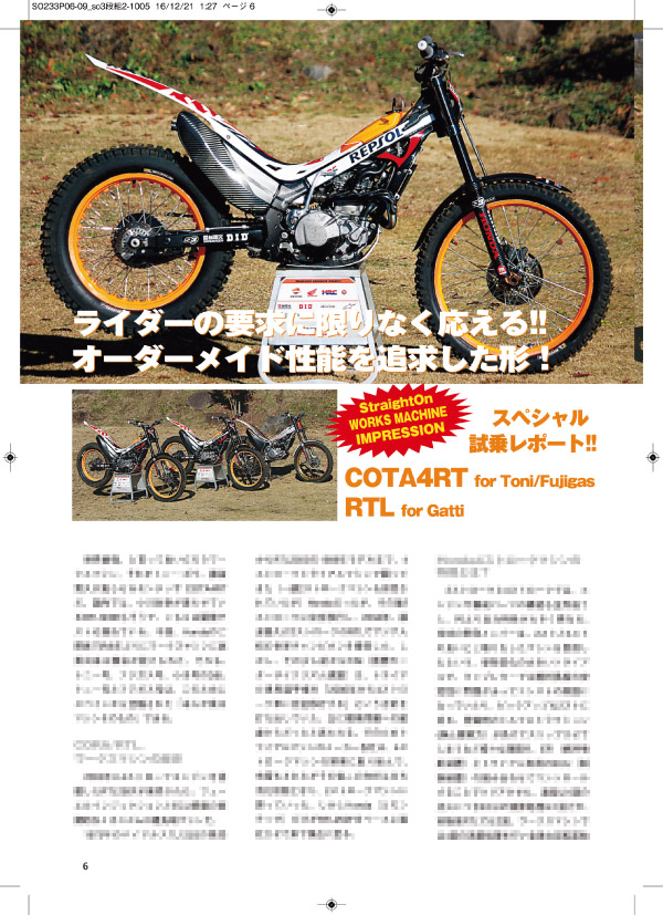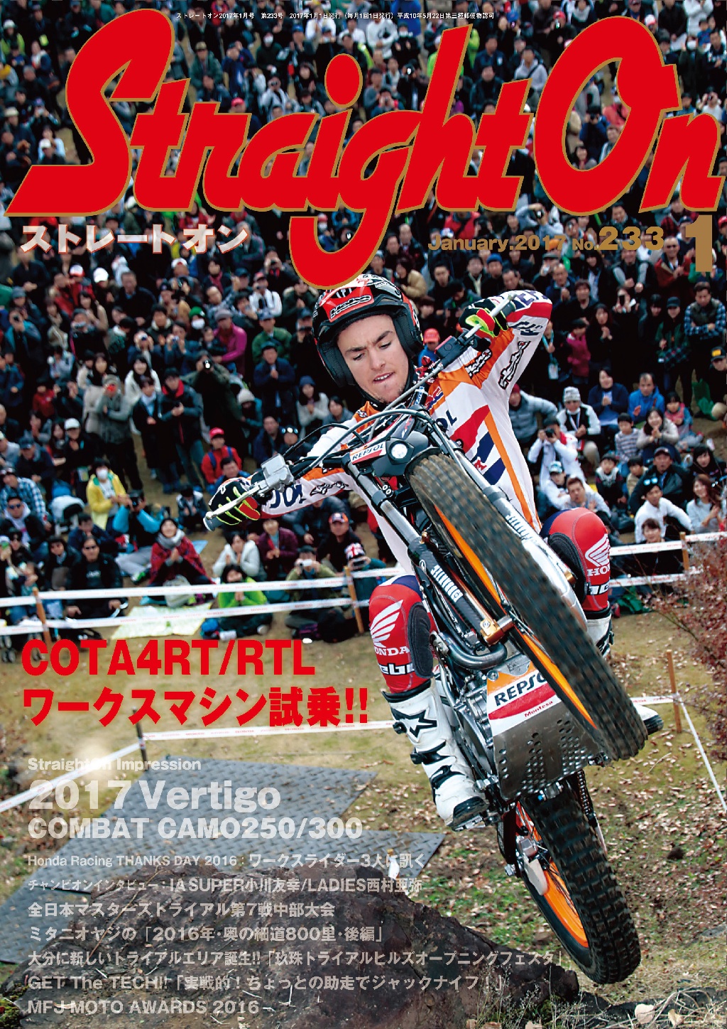 さて、オンラインショップでストレートオン2017年1月号の発売を開始しました。今月の巻頭は、COTA4RT/RTLのワークスマシン試乗レポート。同じように産み出された3台の最強ワークスマシン。しかし、トニー号、フジガス号、ガッチ号では全然キャラクターが違った!他、ベルティゴ試乗など最新、興味津々レポート満載。さらに詳しくはオンラインショップでご確認下さい。