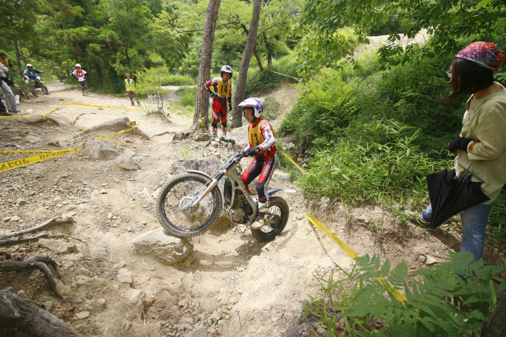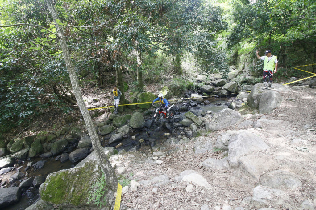 年代別によって、赤、緑、黄とゲートマーカーが配置されて、それぞれ難度が違いますが、それは技の引き出しの多さやコントロールやボディアクションの正確さが問われるモノです。今回も、いつも通り「根性一発、決死の覚悟、落ちたらどうしよう…」と言うセクションは一切無くて、危険度はかなり低く(無い!とは言いません。トライアルですから)錬って錬って作られていましたよ。ただ、亀岡の天然沢を走る、曲がる、登るなど、手強さはそれなりにあって、技の見せどころ、発揮どころも多々ありました。