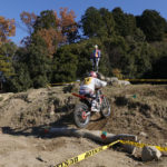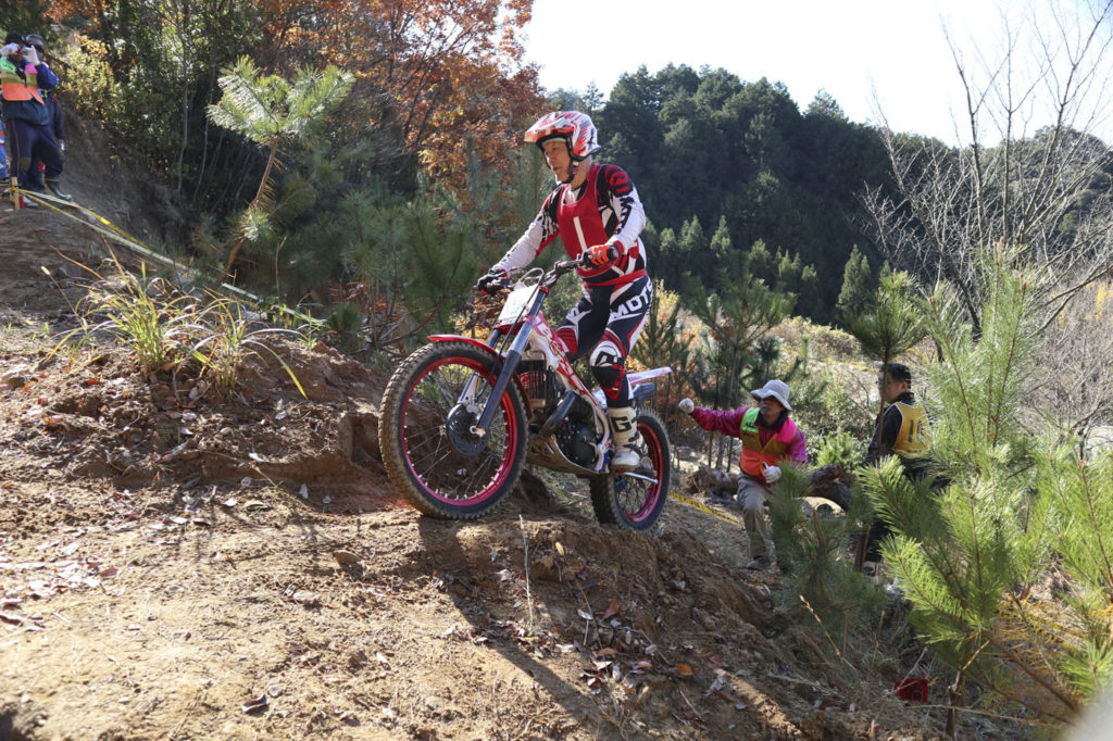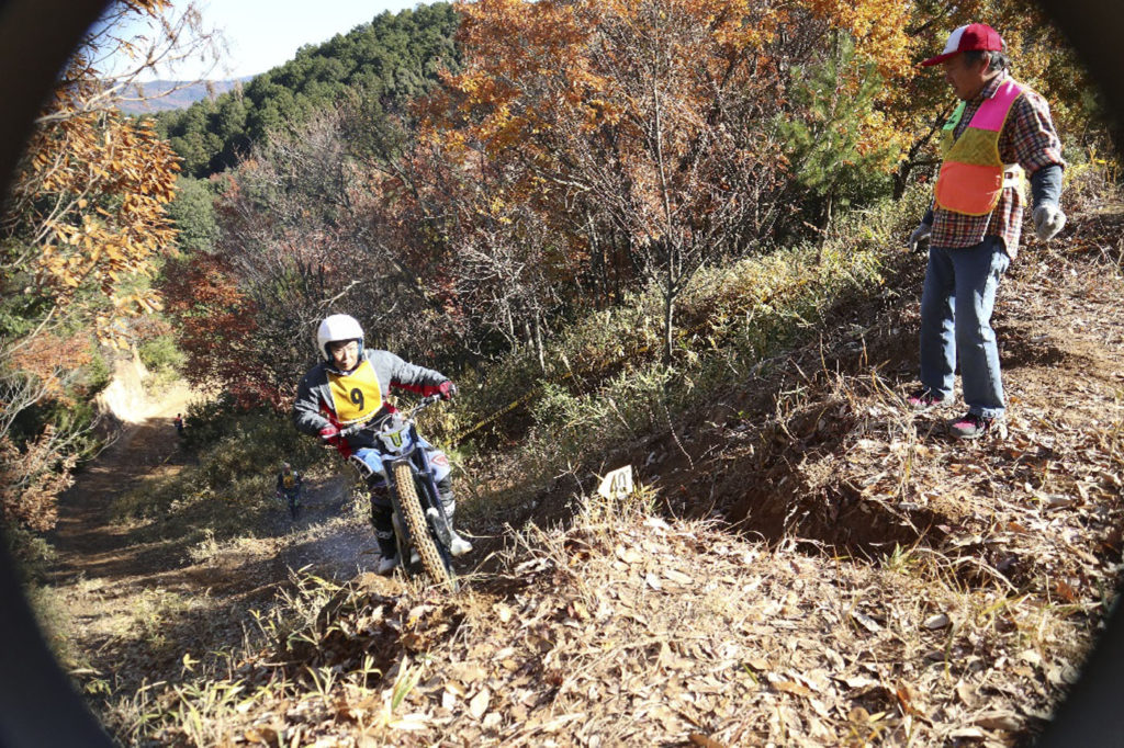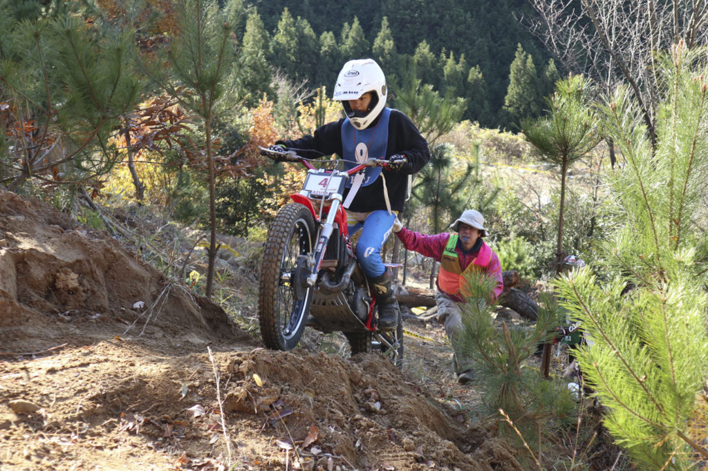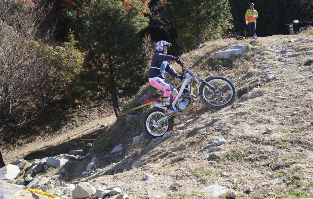 毎戦60歳以上の選手の熱いバトルが繰り返されていますが、今回はウイメンズCクラスに17歳ライダーのエントリーがありました。海野梓選手です。日本航空高等学校の学生で、モーターサイクル部所属です。顧問は60歳代クラスに出場した府玻司選手。石川県の古豪ライダーです。海野選手には、学校を卒業しても是非トライアルを楽しみ続けて欲しいと願います。ビギナーからベテランまで、老いも若きも同じ舞台で楽しめるのがトライアルの良いところですからね。