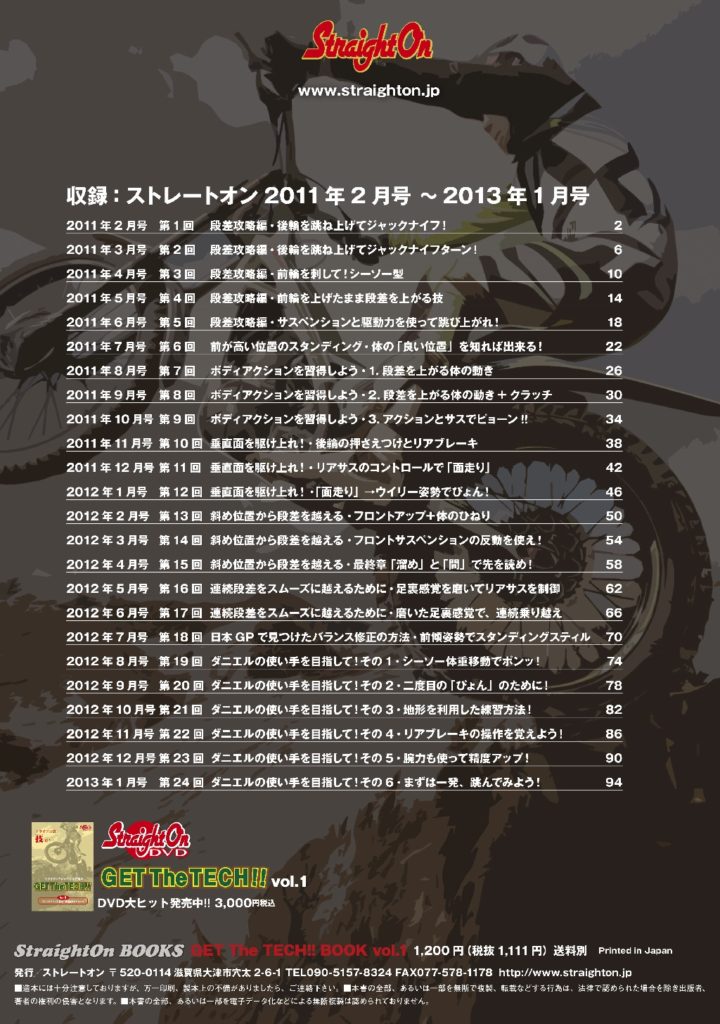 さて、トライアルって、レベルを問わずテクニックの修得、そのための練習そのものが楽しいですよね。でも、どうせやるなら正しい方法でレベルアップしましょう!ということで、ストレートオン連載中の大好評企画「トライアルマジシャン小谷徹のGET THE TECH!!シリーズを一冊にまとめました。vol.1は第1回〜第24回、2年分です。これがたくさん売れたらvol.2→vol.3と発行したいのですが、vol.1が売れないと倉庫に空きスペースが出来ないので…(T_T)