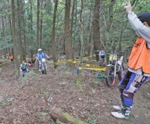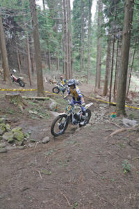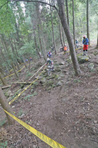 選手たちもいつザッとくるか全くわからない状況なので、コメントを言う間もなく先を急ぎます。すると、焦りから小さな小さなミス、一回だけの足つきなんぞもする選手が何人もいたりして、普段とは違うレースに。とにかく、一名を除いて全選手が早いペースでセクションを回ります。