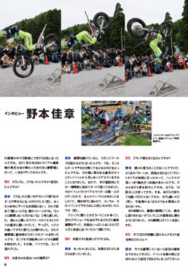 9月号は、前々から取材を重ねていたIAS野本佳章選手のインタビューです。日本でただ一人、バックフリップという大技を駆使するトライアルライダーであり、これからオートレーサーにチャレンジするという新しい人生に向かって歩き出しました。