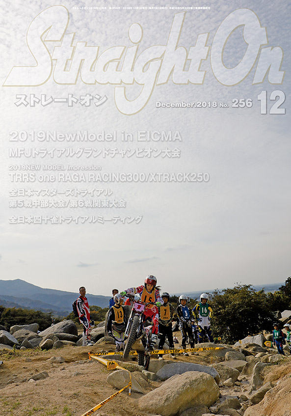 12月号の内容は、マスターズトライアル後半戦の様子、EICMA(通称ミラノショー)のトライアルマシン展示、試乗レポートはTRRS、他には四国で初開催のMFJトライアルグランドチャンピオン大会など、時事的内容盛りだくさん。もちろん連載企画もバッチリです。