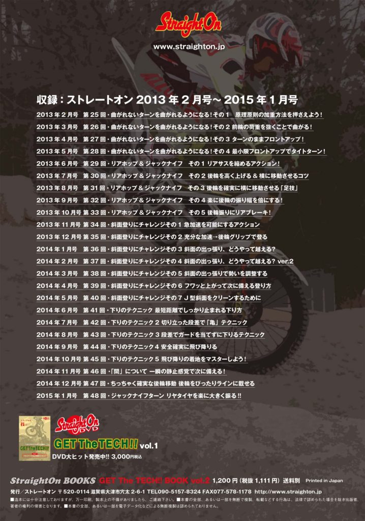 お待たせ!GET The TECH!!BOOK vol.2まもなく発売!! P 2018年12月2日 , by straighton-DM K オンラインショップ 読んで学ぶトライアルテクニック「GET The TECH!!BOOK vol.2」が12月10日発売予定! まもなくオンラインショップでも発売開始します。しばしお待ち下さい。 ストレートオン2013年2月号〜2015年1月号に掲載された連載「GET The TECH!!」2年分の企画を一冊にまとめました。 これを読めば後輪のコントロールとヒルクライムの上り下りがバッチリ! 一冊1,200円税込 送料100円